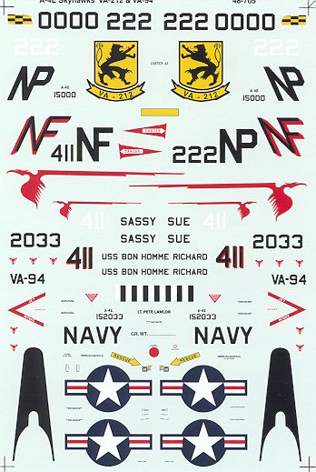 The first aircraft is from VA-212 on the USS Hancock circa 1971. As with the other aircraft, it is in light gull grey over white. Though painted in a gloss, the paint rapidly lost its sheen and became a semi-gloss. Thanks to reader Tom Brown, I can report that this particular Skyhawk was lost in a non-fatal accident on 27 June 1966. That means that the markings shown are not from 1971 as stated on the sheet, but from the November 1965- August 1966 Cruise. VA-212 did not survive the draw-down after the war.