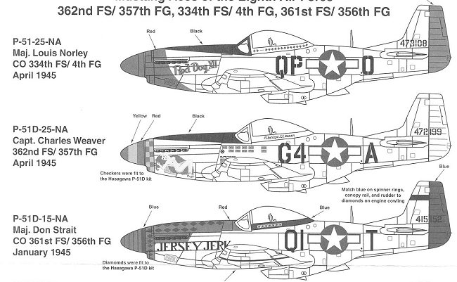 The third plane is 'Jersey Jerk' from the 361FS / 356 FG. It has a red nose on which the blue diamond decal will fit. Good luck with the blue rings on the spinner. This plane also has a blue canopy surround and blue tail.