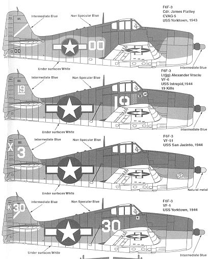 First is Cdr. Flatley's CAG bird from the Yorktown in mid-1943. Like the other subjects, it is in the tri-color paint scheme common to all F6F-3s and the very early F6F-5s.