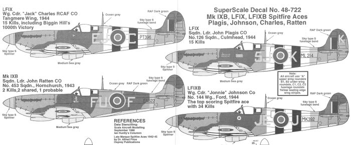 Included on this sheet are markings for any one of four Spit IX aces. All of the planes are painted in the same colors and three of them have D-Day stripes on them. There are sufficient markings to do one aircraft and a lovely set of data markings. The instruction sheet includes a very good data placement guide so finding out what goes where shouldn't be a problem.