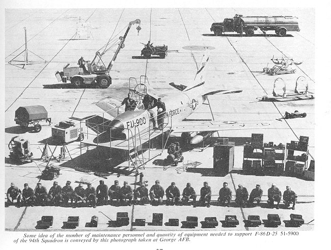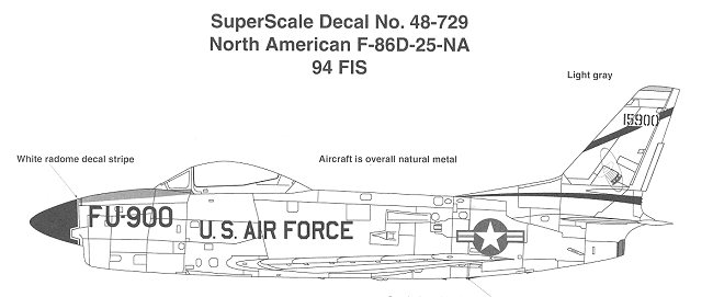 Superscale's first D sheet is for one of the most photographed F-86Ds around, and that is from the 94 FIS. You can see a picture of this plane in the well known (at least to F-86D fans) photo showing all that is needed to support the aircraft. Superscale's earlier 94 FIS sheet had mistakenly used the current 94FS colors of blue and white. Research by Norris Graser and others have proven these colors to be yellow and black as shown is several contemporary color images. It goes to show that black and white images are difficult to get color information from.