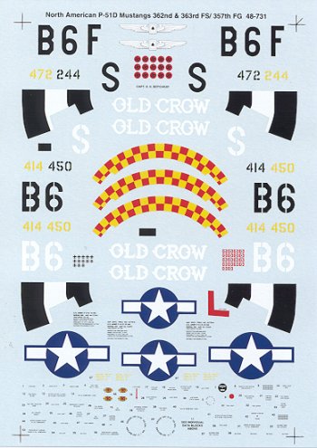 Next is a couple of 'Old Crow's. Bud Anderson is a very popular modeling subject. Your editor has built both of these schemes over the course of his modeling career. Now you get them both on the same sheet and can do both of them, should you wish. If you do the camouflaged version, you'll have to paint on the wing and tail plane stripes, but the lower D-day stripes are provided.