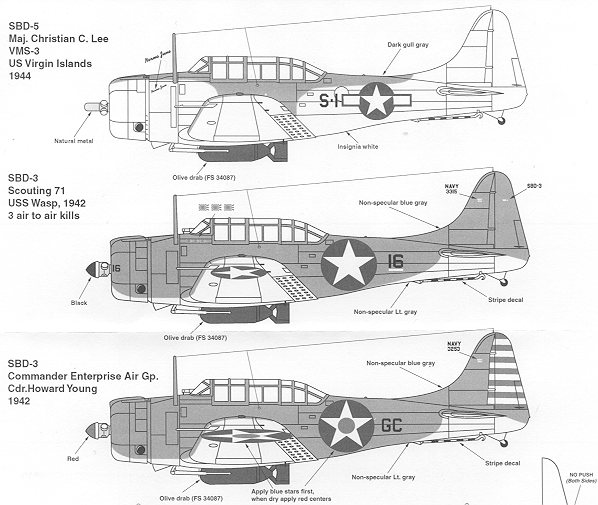 Starting at the bottom on this one, is a pre-Midway SBD-3 in the standard blue-grey over light grey. It has the then-required red and white rudder stripes and the HUGE insignia with red centers. It is also the Air Group commander's plane so has the GC markings (for Group Commander) aft of the insignia.