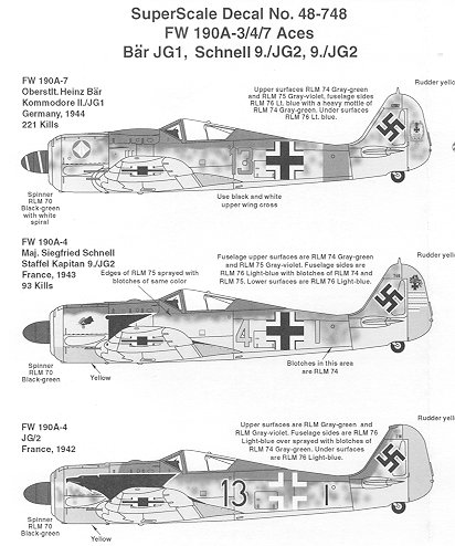 This particular sheet is for FW-190A aces. Each sheet includes full insignia and unique markings for each plane and a full stencil suite for one of them. As will all of the latest Superscale releases, the decals are crisp and clear with no misregistration.