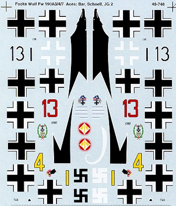Next is Siegfried Schnell's FW-190A-4 with JG 2. It has a yellow rudder with his score and a yellow panel under the nose. It also has a large black area behind the exhaust that is provided as a decal.