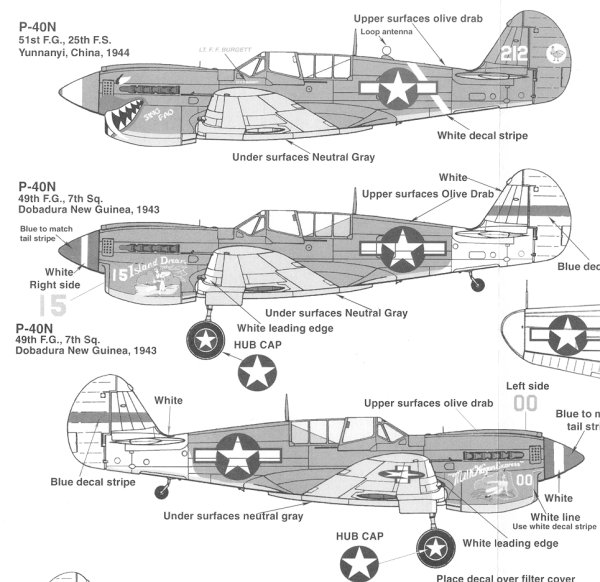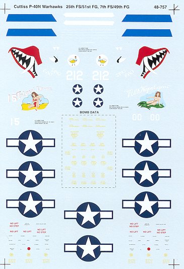 This sheet is for the later P-40N variety. All aircraft on this sheet are in the olive drab over neutral grey color scheme. The 49FG aircraft have white tails and wing leading edge ID markings.