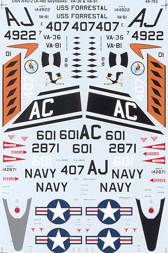 The other scooter on the sheet is from VA-81, a long standing unit that currently flies F-18 Hornets. This plane has lots of color in its orange markings with black diamonds. You'll have to paint the rudder to match, but it beats trying to put a decal over those corrugations. This very colorful plane was part of the Forrestal air group.