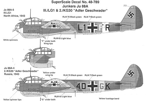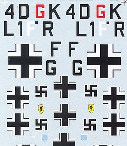 This sheet has a Ju-88A-5 from III./LG 1 in North Africa and has the usual white fuselage band required for this theater. The spinners are also white and, unusually, the rudder is in overall RLM 70 rather than the usual splinter scheme.
