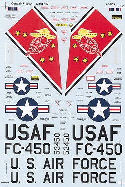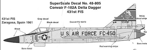 This sheet contains the markings for one F-102A. That being a 431st FIS aircraft from Zaragosa Spain in 1961. During these years, the USAF had FIS squadrons all over the world and it was hoped that they would be able to take out any planes headed for US bases in Spain or Morocco. The sheet itself is quite colorful and offers the full range of data markings as well. A great sheet for the recent reissue of the F-102.