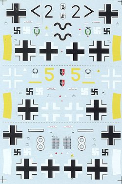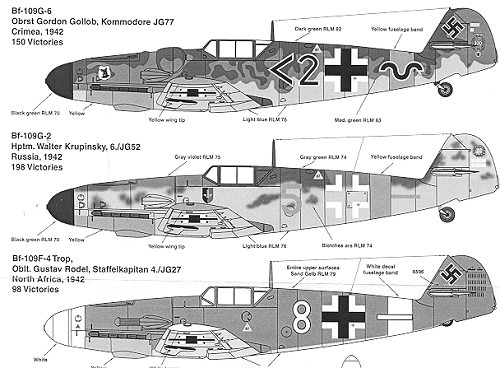 First on this sheet is the G-6 of Gordon Gollub while he was Kommondore of JG 77 in 1942. Because of the early date, this must have been on of the first G-6s around. Actually, I'm thinking 1943 is more than likely as production of the G-6 didn't start until October of 1942. Anyway, it is listed as RLM 82/83 over RLM 76. Again, these upper colors have to be locally produced ones as RLM 82/83 were not used on new aircraft until 1944 at the earliest. Eastern Front units often experimented with local paints for camouflaging their aircraft. This one has full Eastern front markings which consist of the lower cowling, lower wing tips the fuselage band in RLM 04 yellow.