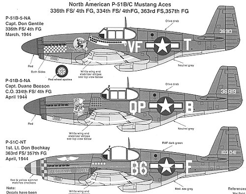 First plane is Don Gentile's 'Shangri-La', undoubtedly one of the most built Mustangs there is. New info on this sheet from others I've seen is the red wheels.