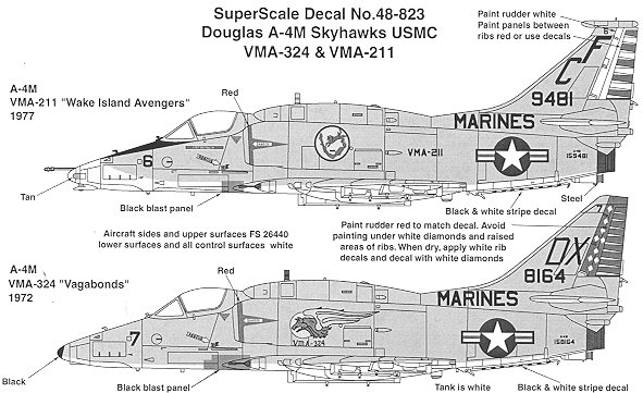 The VMA-324 Scooter is an early version without all the extra RWR radar antennas nor the fin tip pod. You'll notice that the design of the white underside does not swoop up so soon on the nose as it does with the 211 bird. Not having the Hobbycraft A-4M, I'm not sure if the early version can be built, but it should be an easy conversion if not.