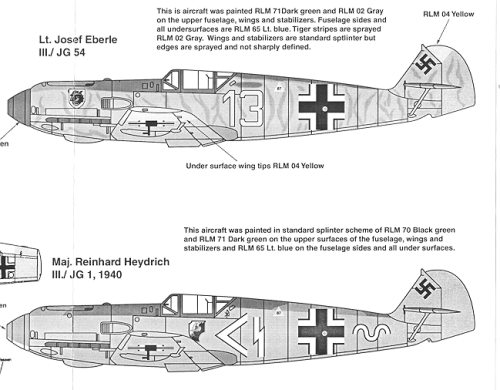 The other is Maj. Heydrich's aircraft from III./JG 1. Camo on this planes is RLM 70/71/65 with no fuselage mottling. The spinner is RLM 25 green with a quarter of it in white. Both planes are from the 1940 time period.