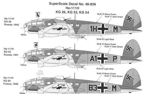 First is from KG 26 in Russia during 1942. It has white spinners but is otherwise devoid of Eastern front markings. Such is not the case for the KG 53 plane. It has yellow spinners, lower wing tips and fuselage band. Finally, another Blitz bomber from KG 54 in France during 1940. The kit of choice for this sheet is the very nice Monogram/ProModeler version. I'd highly recommend researching the references to ensure that you are doing the proper subtype as SuperScale doesn't provide that info and there were differences.