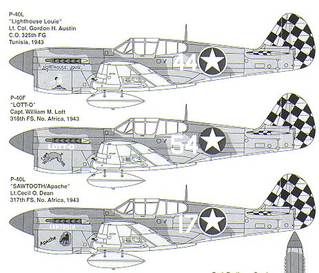 First is the group commander's plane, 'Lighthouse Louie'. It is a P-40L. Now the L model was a lightened F and one of the things done were that the outer wing guns were removed. Often these were reinstalled in theater as the only modification done to the plane was to cover over the outer gun hole. The mountings and shell ejector chutes remained. Check photos to be sure.