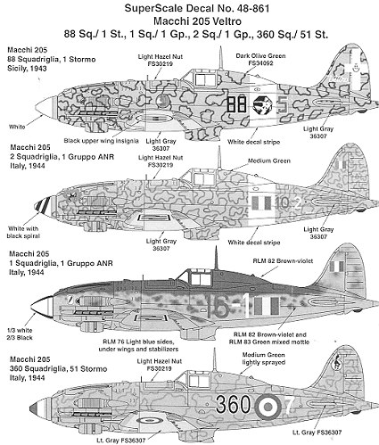 To my knowledge, this is the first MC.205 sheet that Superscale has done, and if not the first Italian sheet, then the first one done in a very long time. The kit of choice is the Hasegawa M.C. 205 which gets released from time to time with some different decals in it to justify a 'new' release.