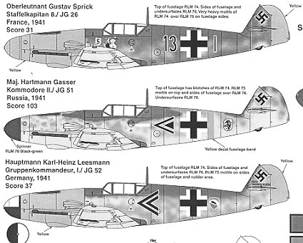 Finally from I./JG 52 is Karl-Heinz Leesmann's aircraft from the 1941 time frame. It also has the yellow nose and rudder with a spinner that is halved in black and white. Mottling is pretty well standard for this aircraft.