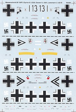 From II./JG 51 is Hartmann Gasser's aircraft. It has a very thin yellow fuselage band and a rather odd presentation of the Kommodore's markings. A hold-over from the 109Es of this unit is the crow with an umbrella on the rear fuselage.