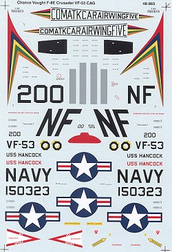 The aircraft is quite familiar to your editor as I did my Monogram F-8E in these exact markings a bit over a year ago. It is the CAG bird for VF-53 and complete with the multi-colored tail markings. In this sheet, the name of the ship is given in both red and black, though there is no indication of which is to be used, so it must be left up to the builder. The sheet also includes the non-skid areas for the rear of the fuselage and the black sections that are over the guns.