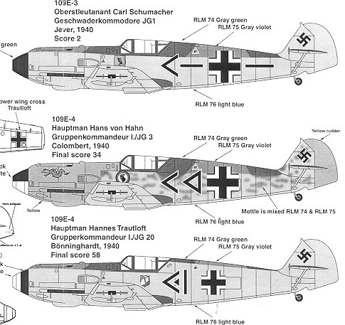 Finally there is Hannes Trautloft's E-4 while he was Kommandeur of I./JG 20 in 1940. His is also about as plain as you can get other than the black/white spinner and unit/position markings. This one has the very high fuselage camo demarcation line.