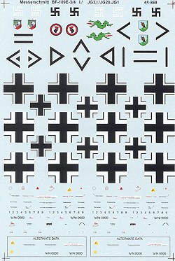 For the early E-type 109s, you have a choice of Tamiya, Hasegawa or Hobbycraft, though I don't think Hobbycraft does a 109E-3 right from the box. The sheet provides full insigia for all and enough date markings/swastikas for two.