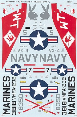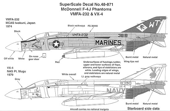 First off, in light gull grey over white, is an aircraft from VMFA-232 around 1974. Superscale has provided the red tail as a decal instead of requiring the fin to be painted, which is nice. I would, however, make sure the entire fin is painted white prior to application to get the proper color saturation. This aircraft has the large wing stars that were one of the several options for the Phantom II. Walkways are not provided, but, fortuitously, Superscale recently released a sheet of USN/MC F-4 walkway decals!