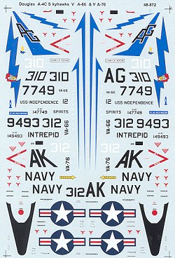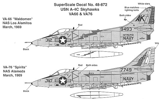 The two units are VA-66 which was aboard the USS Intrepid and VA-76 from the USS Independence. Both are from 1969, so were probably some of the last fleet squadrons to operate the C model of the A-4. Though probably just my imagination, both schemes look quite similar to what is on the decal sheet for the Fujimi 1/72 version. VA-76 was the only scooter unit to knock down a Mig during the Vietnam War so all of its Skyhawks carried the kill marking on it.