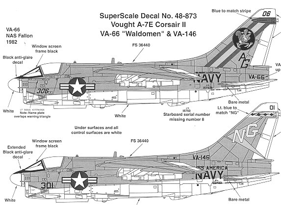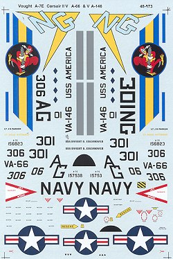 Recommended kit is the Hasegawa A-7E which has recently been reboxed by Revell AG. If you have an ESCI A-7E, I suggest giving it away as it is a truly horrid kit. There are enough common markings and insignia to do one of the subjects.