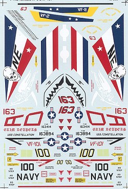 The other F-14D is from VF-101 and this one has black on the tail, ventral stabilizer and the canopy area. Like the black canopy area on the VF-2 bird, this will all have to be painted by the builder. Unusually, this one also has a sharkmouth on the radome which looks very much like those applied to VF-111 aircraft.