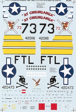 The second is 'Ay Chiuhuahua' from the 66 FS/57 FG when based on Corsica during 1944. It has a red forward cowl and prop spinner. The yellow bands on the sheet are for this aircraft and one will have to paint the wing pylons prior to attaching them.