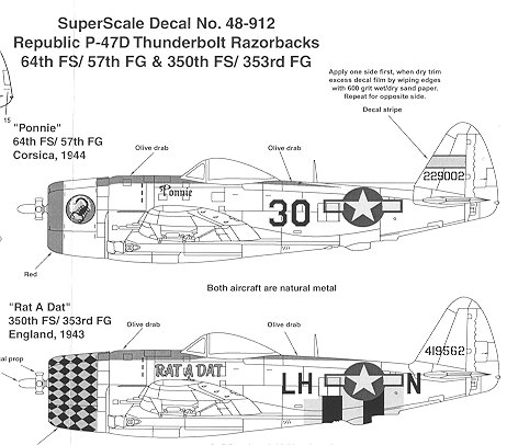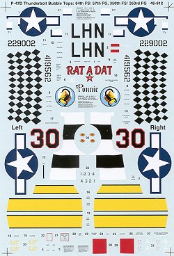 The other is from the 350 FS/353 FG. 'Rat-a-dat' has the remnants of invasion stripes on the lower fuselage. This plane has the 13' Curtiss-Electric symmetrical prop The cowling needs to be painted yellow prior to application of the diamonds. Instructions are given on the best way to apply this large decal.
