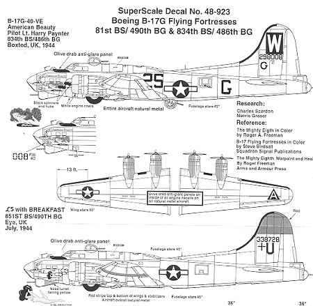 The other is another 490 BG plane '£5 and Breakfast', referring to the cost of an overnight stay with companionship. As with other 490 BG aircraft, it has red wing and tailplane bands and a red fin tip. This one also has a yellow nose gun fairing. It seems that 490 BG planes had no belly turret if one is to believe this and the previous sheet's drawing.