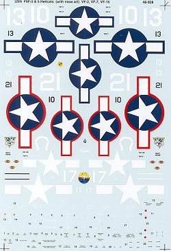 Pulling up some nice Hellcat markings off some older sheets, this one covers a goodly selection of mostly -3 Hellcats. For kits, go with Hasegawa or Arii/Otaki, depending on how your budget happens to feel at the moment. Both are very nice kits. The -3s are all in the tri-color scheme of Sea Blue, Intermediate Blue, and White (non-Specular, of course). The F6F-5 is in overall gloss Sea Blue.