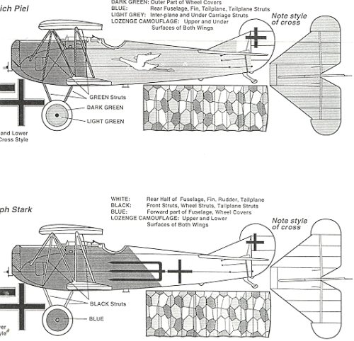 The other aircraft is the mount of Rudolph Stark of Jasta 35. is plane is in a more tasteful black forward with white on the rear of the plane. Naturally, the wings of this and the other plane are in the lozenge pattern. Though it isn't mentioned, I'm thinking that the small wing between the wheels is in the lozenge pattern.