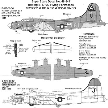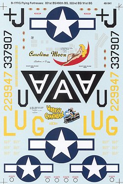 The G is a bare metal aircraft from 851 BS/490 BG. It carries the red bands on the wings and tail planes, the color also going on the fin tip. The builder will have to paint those colors on 'Carolina Moon'. Judging by all the mission markings, this aircraft was probably rather weathered.