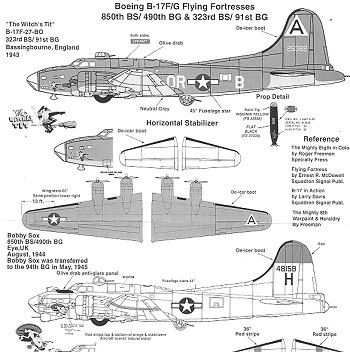 The other is 'Bobby Sox' from the 850 BS/490 BG. This natural metal B-17G has the large red markings on the wings, stabs and fin that you'll have to paint, but which add a lot of color to the aircraft. It seems to have a Cheyenne tail turret and perhaps staggered waist gun positions. Check the references to be sure.