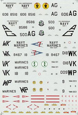 This sheet covers five 'Scooters', all in the light gull grey over white scheme. There are plenty of kits out there for this sheet in 1/72. Probably the best of the lot are those produced by Fujimi. Before that, the ESCI kit was the one to have. This kit has recently been reissued by Italeri at a rather steep MSRP, so I'd suggest alternate sources for this one! Airfix makes an early A-4A that is best left alone and the A-4E produced by Hasegawa is oversized. There was an IPMS/USA nose conversion for the ESCI kit to make a C model.