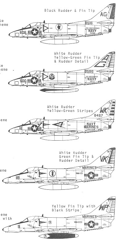 From VMA-224 comes this A-4C with green for the rudder stripes. Most unusually, this one has both Navy and Marines on the fuselage side.