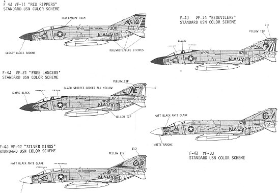 Here are five super schemes for the F-4J Phantom II. All are in the Light Gull Grey over White scheme. There are no insignia or data markings included as those were on other sheets. The suggested kits were the Revell or Airfix F-4J, but since then there have been kits by Italeri, ESCI, Monogram, Fujimi and Hasegawa that are much better than the old Revell or Airfix offerings.