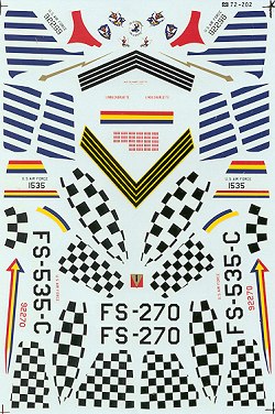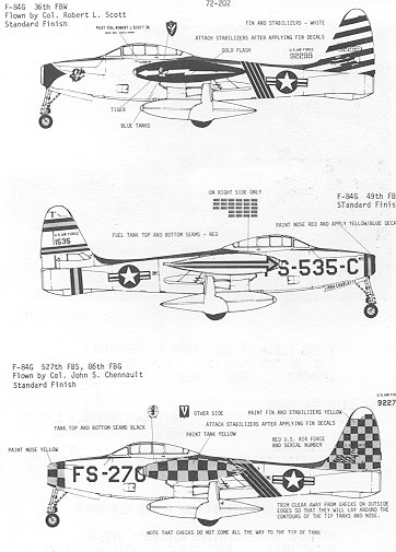 Finally, a 527 FBS/86 FBG Thunderjet flown by Col. John Chennault. This aircraft has lots of color with the nose, tanks and tail painted yellow before applying the black checks.