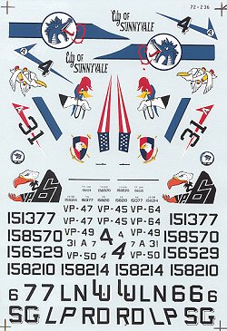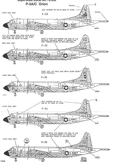 This sheet has five different aircraft on it. All of the insignia and common markings will have to come from the kit or other sources as they are not included. In fact, the instructions are actually quite poor. You see, Microscale was run by two brothers. They decided to split up with one taking the aircraft decals and one returning to trains. The one who did the aircraft named his company Superscale. It wasn't cool to have 'Microscale' printed on the instructions so he photocopied them on a single side of a sheet. Unfortunately, with a lot of sheets, there was info on the back side that never got copied, or was copied so small and so poorly that the information was useless. This is one of those sheets.