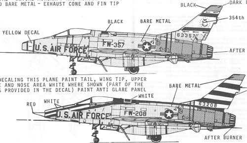 First aircraft is not identified on the sheet at all. However, it is from the 352nd TFS/ 354th TFW that was based at Myrtle Beach. The second aircraft on the sheet is from the 494th TFS/48th TFW based in the UK, if I'm not wrong. This unit went to much paint for their planes and had them marked in very nice red and white stripes. The white part will have to be painted to use most of the markings on this model, but the red stripes are provided. The nose section has both the red and white as it would be most difficult to mask. You need to check references to verify if the planes were bare metal or painted aluminum. A lot of what was assumed to be bare metal was actually aluminum paint.
