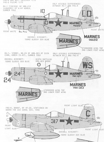 The AU-1 from VMA-212 has a nice white arrow on the forward fuselage as well as white on the prop hub and very tip of the tail.