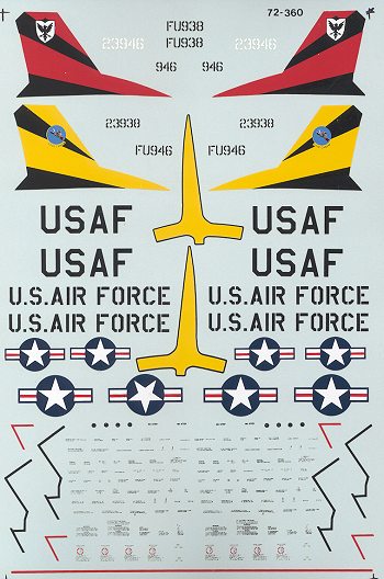 The Microscale sheet offers two complete aircraft. It is undoubtedly designed for the elderly Airfix kit, but should fit the newer and much nicer Hasegawa 1/72 F-86D without too much trouble. Since this is the Microscale packaging, there is a full data placement chart given. However, it shows an F-86E/F so how useful it is to placement of decals is questionable. A good source for common data placement is the Ginter book on the F-86D as there are lots of closeup shots of the airframe in its pages.