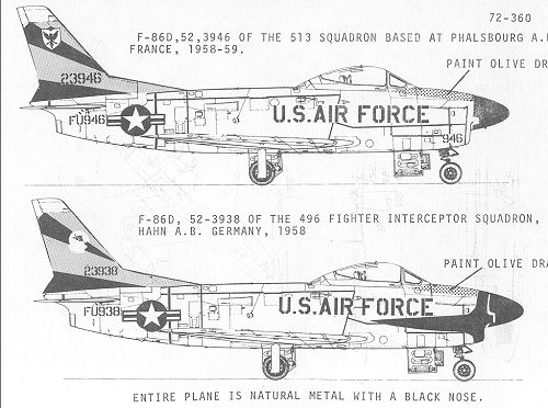 Despite that, so much emphasis was placed on bomber interception, that there were a huge number of F-86D squadrons throughout the US and in NATO countries. These units were generally very colorfully marked and these two are no exception.
