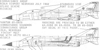 Going on the theory that one can never have enough F-4 decal sheets, here is one just for ANG Recce birds. All of them are in the SEA scheme of FS 34102/34079/30219. Those not in the SEA wraparound scheme will have FS 36622 light grey undersides. For kits, none were recommended, but we now have a number of excellent ones from Hasegawa and Fujimi. Also around are ESCI versions which are nice, though not as detailed. All of these RF-4Cs will have the older and more square camera access panels.