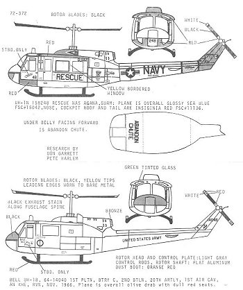 The first aircraft on the sheet is a UH-1N from NAS Agana, Guam. It was used for SAR and is listed as being glossy sea blue with red bits. I can tell you from my time on Guam and the helos around in 1980 had replaced the sea blue with white and the red with international orange.