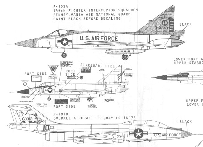 The third aircraft on the sheet is a 146 FIS F-102A. Probably one of the more interesting schemes with its all black tail and fuselage spine, the 102 was painted in ADC grey, though there were examples painted in aluminum. Check your references. The 146th now flies KC-135 tankers as there was a move afoot many years ago to change most of the guard into tankers and airlift rather than the 'cool' fighters.