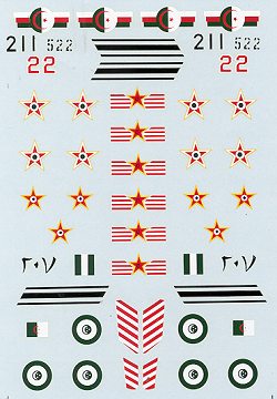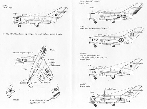 This sheet has five schemes for bare metal Mig-15s. There are no units given and what you basically have is a silver jet with national insignia as camouflaging aircraft during the plane's operational life was not the norm.