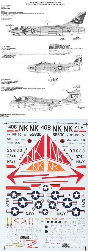 The first aircraft on the sheet is an F8U-1 (F-8A). No carrier is given and it tells you that you must modify any currently available 1/72 Crusader to get this version, though it doesn't seem like too much difficulty. This aircraft is from VF-142 and has a nice red arrow along the fuselage as well as a big red wedge on the tail.